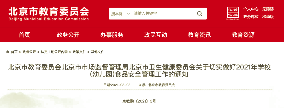 多知网3月3日消息,今日,北京市教委、市市场监管局、市卫健委联合发布《关于切实做好2021年学校(幼儿园)食品安全管理工作的通知》(以下简称通知)。通知提出,要求严格履行校园食品安全校长(园长)负责制和学校主体责任,提升学校(幼儿园)食品安全风险防范和应急处置能力,坚决防止学校(幼儿园)食品安全责任事故发生。