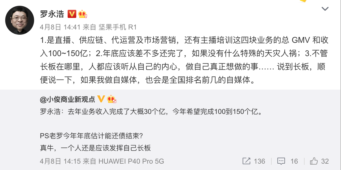 多知网4月8日消息,今天,锤子科技创始人,抖音头号带货主播罗永浩参加首届抖音电商生态大会,在会上,罗永浩表示:“去年(直播带货)完成了 30亿元的业务,今年要把直播电商,代运营,品销合一,营销推广,业务培训以及供应链业务加一块,希望完成100到150个亿。”