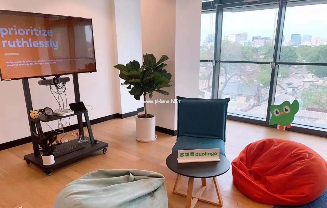 二环内东四附近的胡同里,这栋wework有一整层都是多邻国的办公室,会议室除了传统的大会议桌外,还在另一个区域铺了几张懒人沙发,圆滚滚地躺在毯子上。会议室整侧的落地窗让旁边的胡同尽收眼底,这似乎是这所国际化的美国公司试图融入中国本土的一个隐喻。