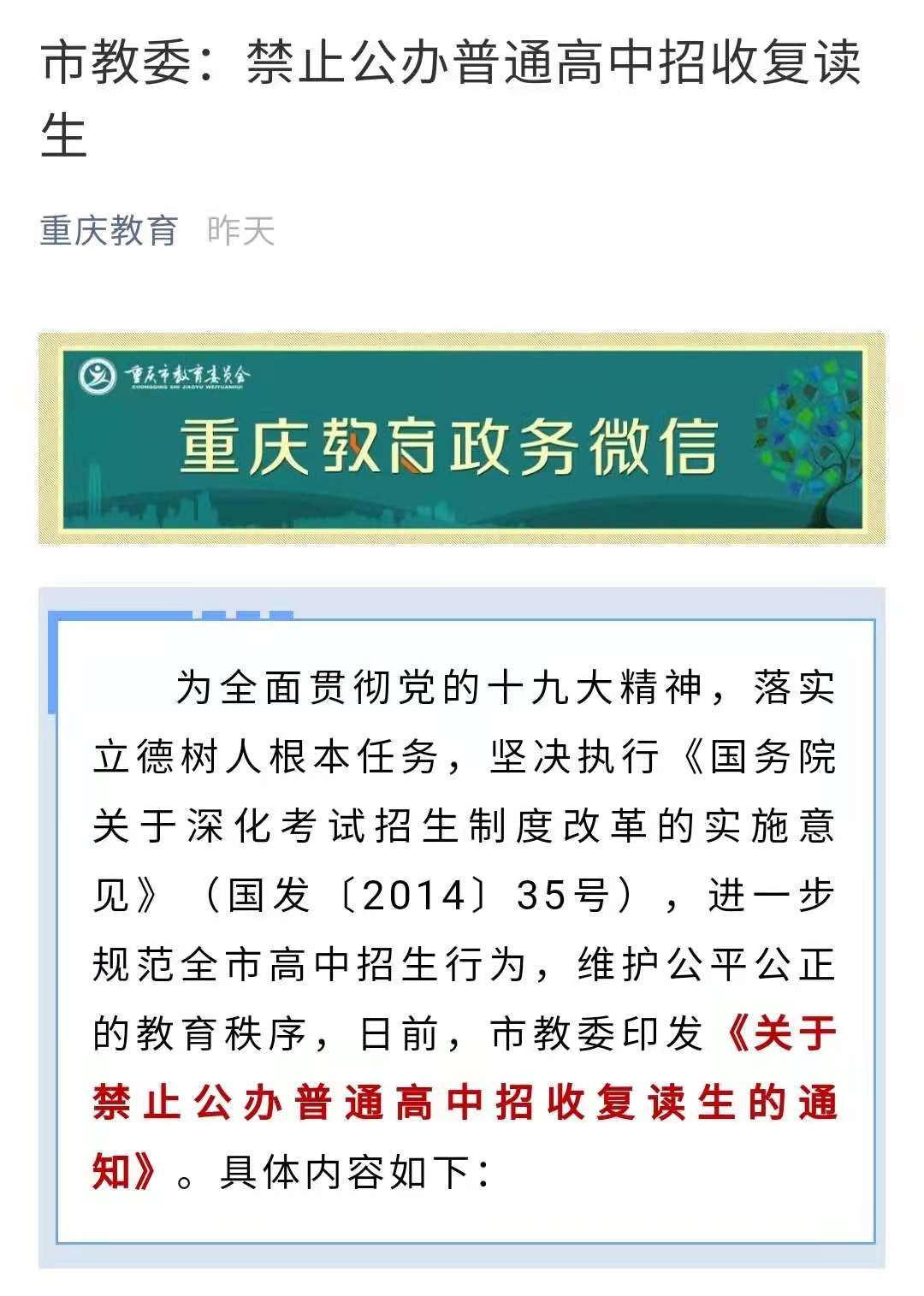 多知网6月17日消息,昨日,「重庆教育」微信公众号发布通知,将禁止公办普通高中招收复读生,坚决纠正为了“一本”升学率和名校录取数举办复读班。