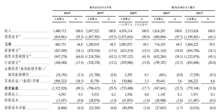 毛利率由2018年的44.8%增至2020年的49.1%,并由截至2020年6月30日止六个月的44.3%增至截至2021年6月30日止六个月的55.9%,主要归因于效率提高及规模经济。