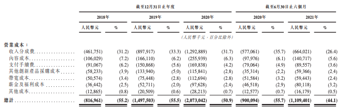 招股书显示,喜马拉雅营业成本包括内容分成费用、版权授权、支付处理费用、互联网设备采购、带宽等,主要开支在于收入分成,2018年、2019年、2020年以及截至2021年6月30日止六个月分别为4.62亿元、8.98亿元、12.93亿元、6.64亿元占总收入的百分比分别为31.2%、33.3%、31.7%及26.4%。