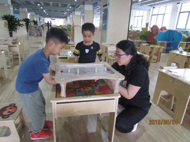 由于是自主游戏教育,杨尚进要求老师在组织孩子游戏的时候,不要指挥孩子,一定要给孩子营造自主游戏的环境。老师做一个示范,孩子学会了以后,就让孩子们自己去玩。