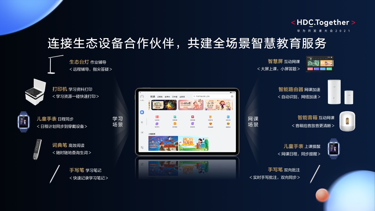 更进一步,通过华为持续构建的鸿蒙生态,华为教育中心正在逐步与生态设备合作伙伴实现场景化的智慧教育服务。