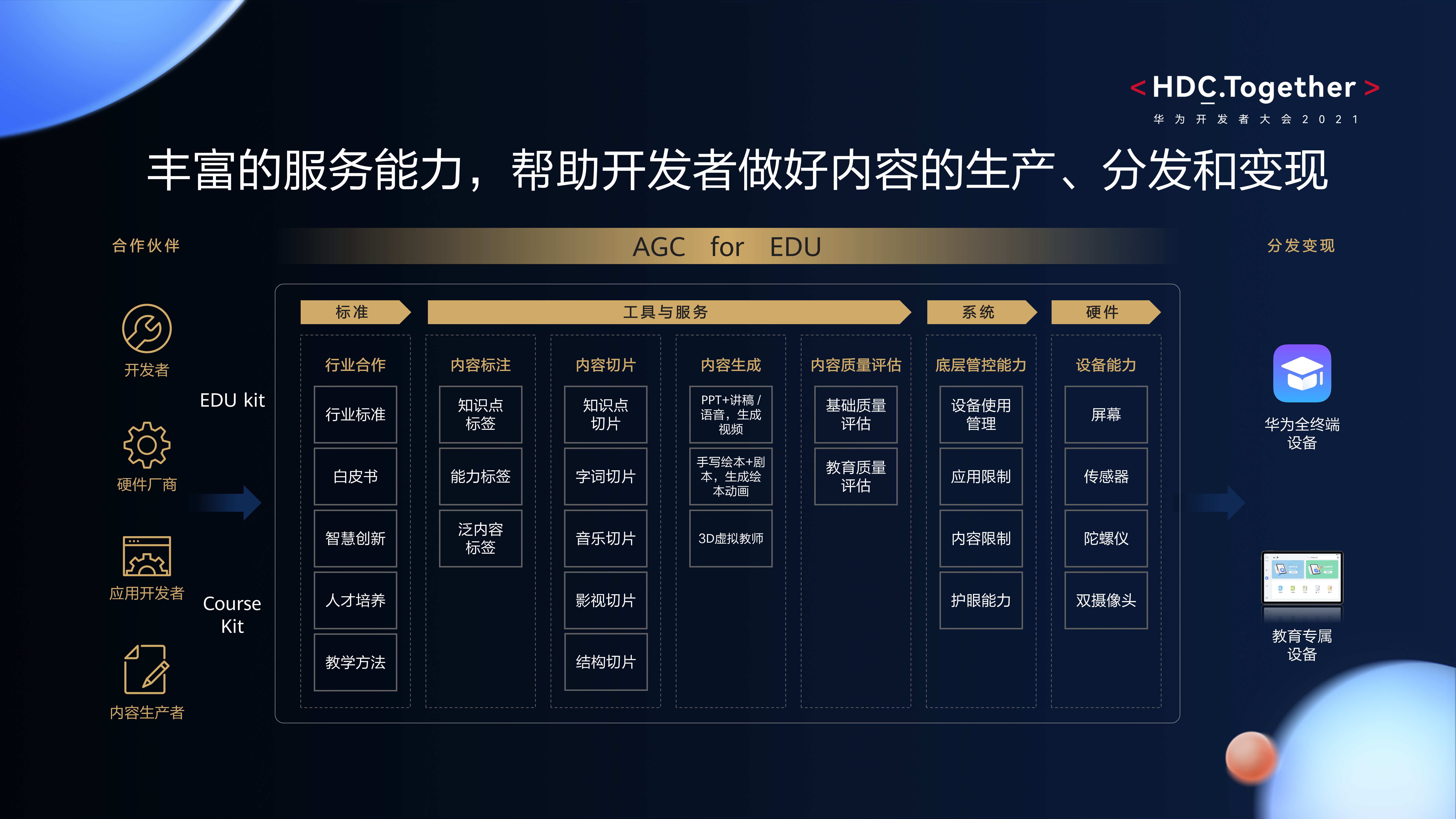 其中,AGC for EDU,即通过提供专业的教育工具和服务,帮助教育App优化高质量的内容生产、分发与变现。内容生产阶段,AGC for EDU将为开发者提供内容标注、切片、内容质量评估等工具服务,协助高质量教育内容生产。同时,依托华为教育中心底层管控能力与硬件设备能力,AGC for EDU将帮助提升内容接入后的使用体验;分发阶段,优质内容将通过华为多终端设备实现更广泛的用户触达,由此完成内容生产、分发到变现的闭环。
