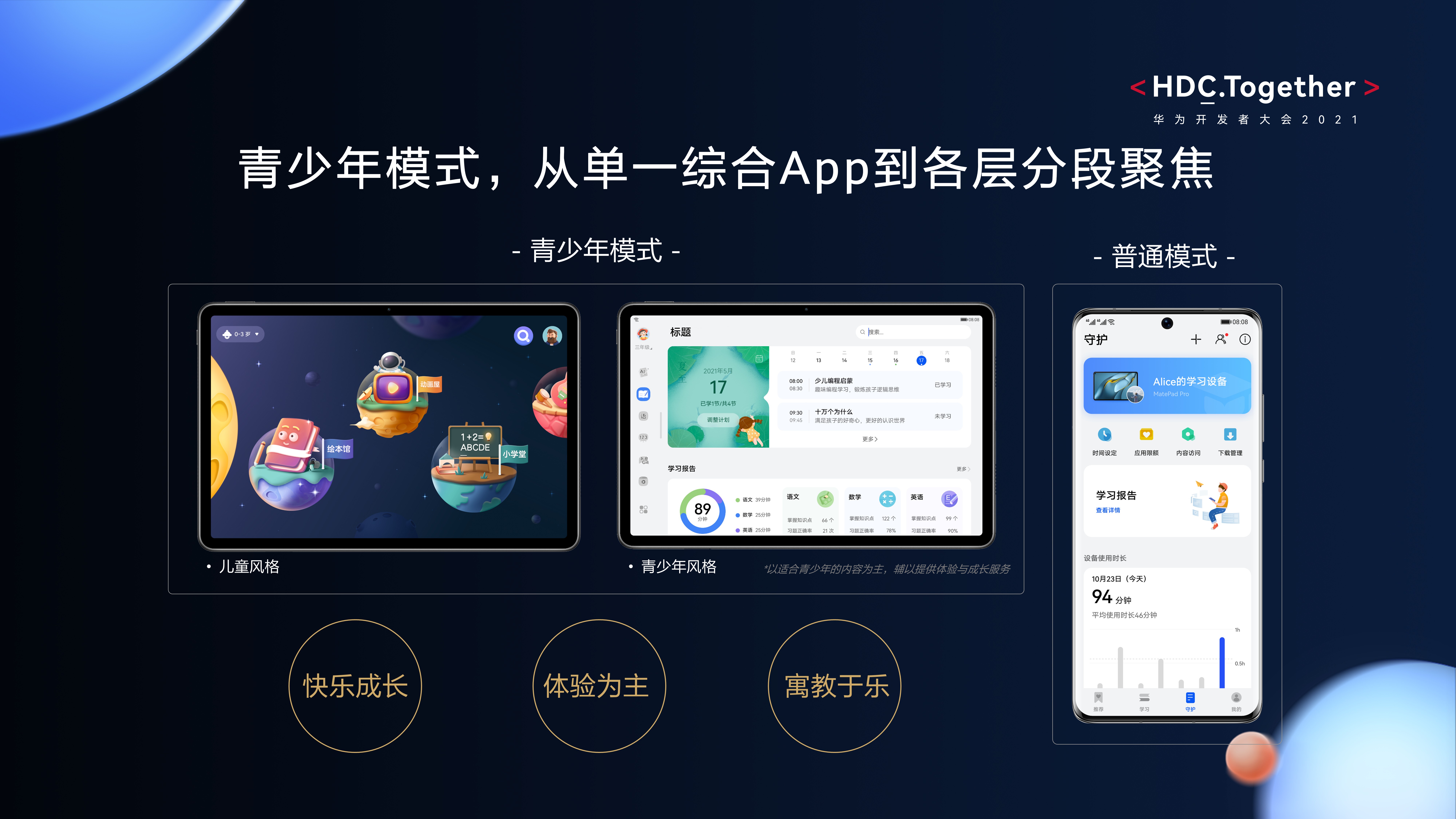 同时,在内容体验层面,华为教育中心还将上线青少年模式,并在UX设计上进一步分为儿童风格和青少年风格,通过分龄推荐学习内容,实现从综合性App升级为根据用户不同学习阶段进行内容分段聚焦的教育平台。