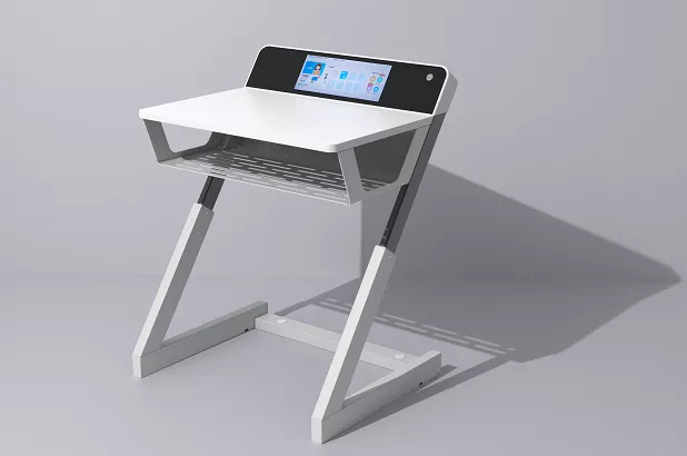首先外形上,水獭智创的数字课桌与传统桌脚直上直下的设计不同,在支撑处选用了斜角结构,整个桌子从侧面看去呈Z字形。