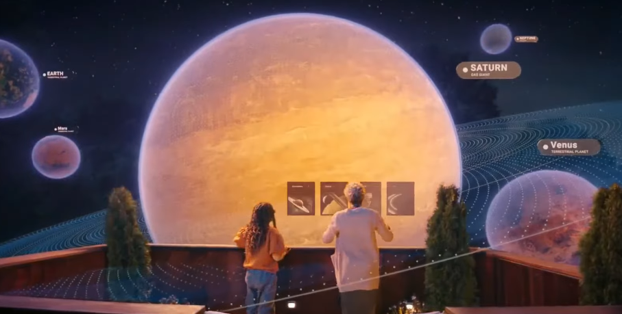 在Facebook Connect 2021大会,扎克伯格用一段影片为全世界展示了元宇宙中教育的可能性——只要戴上智能眼镜,就可以将太阳系的八大行星投射在身前,用手势就可以调出它们的详细信息,将图像放大后甚至能够观察土星的光环。