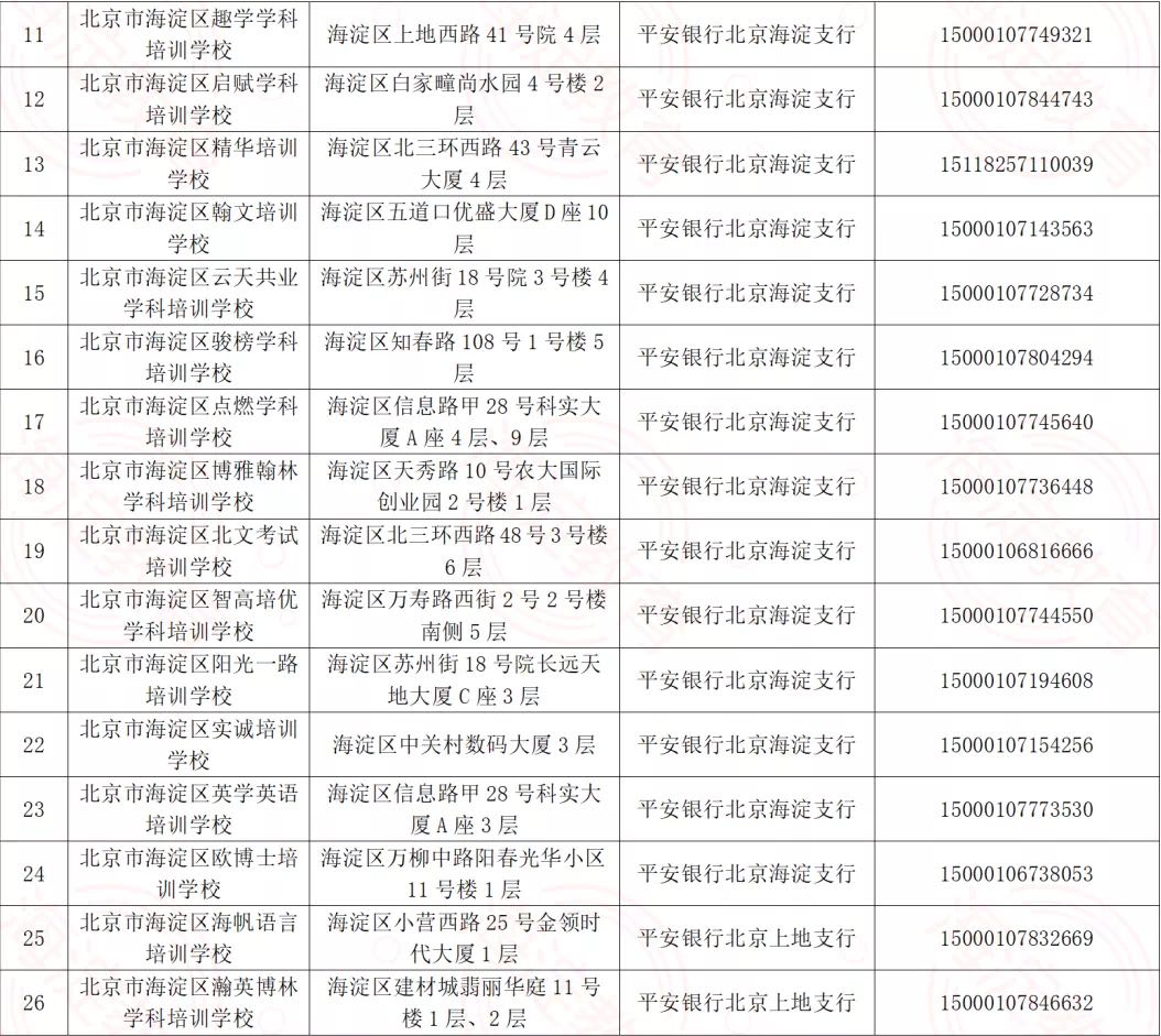 此前,今年1月,海淀教育公示19家校外培训机构培训费收取账号,系2022年1月4日-1月21日期间已完成开班收费备案审核的机构信息。