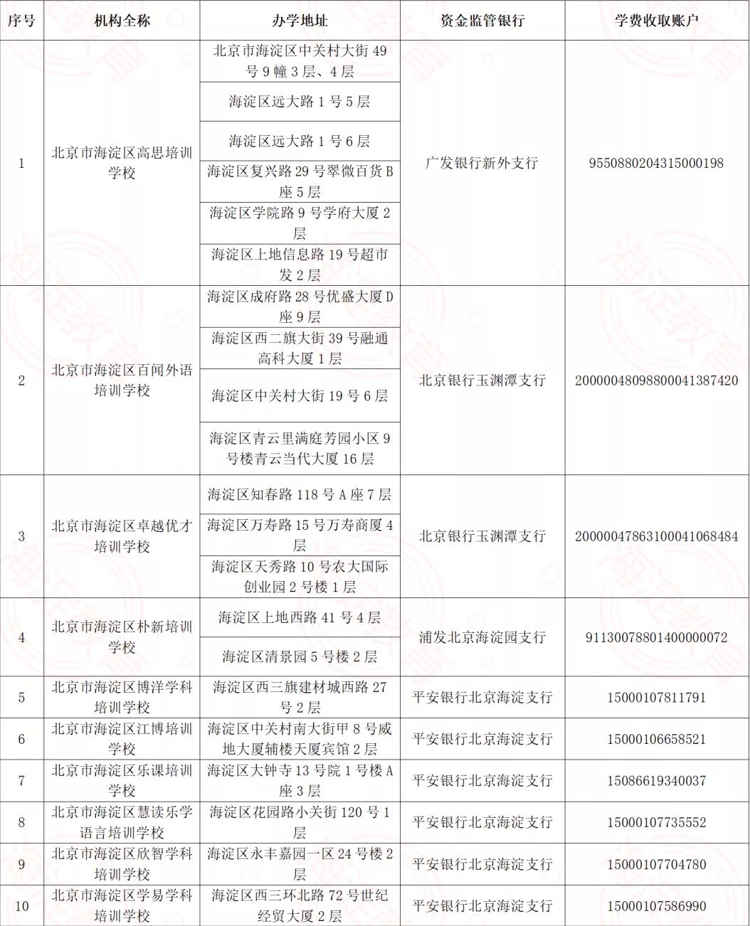 公示称,为保障家长和学员权益,严格规范学科类校外培训机构办学行为,进一步强化对培训收费的监管,根据相关政策要求,海淀区持续对学科类校外培训机构培训费收取账号予以公示。此次公示内容为已完成收费备案审核在2022年2月21日—4月30日计划开班的学科类校外培训机构信息(后续将根据收费备案审核情况动态调整),未在名单内的学科类校外培训机构在此期间不得收费。