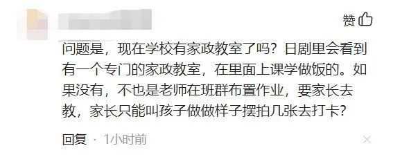 但也有部分网友提出了对劳动课实际落地的考验,比如学校是否要增设家政教室、洗衣房等。