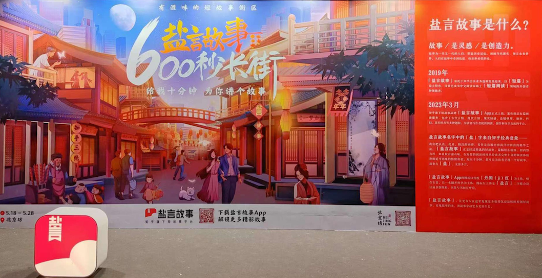 在App上线的同时,自5月18日起至5月31日,知乎“盐言故事”还于北京坊策划了一场“600秒长街”线下活动。活动通过创意互动装置带访客沉浸式走进盐言特色故事。走过长街,访客可以在“戏台”装置前了解“知乎三绝”,也可以通过“画卷”装置领略古代言情故事的魅力,还可以观看“月亮”装置体会脑洞故事的精彩,吸引了众多年轻人前来打卡体验。