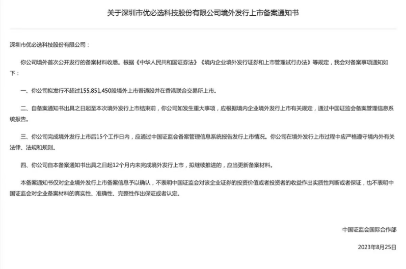 备案通知书显示,优必选科技完成境外发行上市后15个工作日内,应通过中国证监会备案管理信息系统报告发行上市情况。