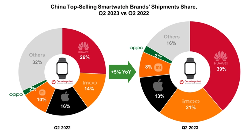 值得一提的是,就智能手表市场份额而言,此前,8月底,全球市场研究机构Counterpoint Research发布的最新全球智能手表跟踪报告显示,在中国市场,受到诸多厂商持续推出新品以及618大促等因素的影响,智能手表出货量仍同比增长5%。其中,华为市占率增至39%位居第一,而得益于疫情放开和返校季等诸多因素,小天才以21%的市占率超过苹果位居第二。