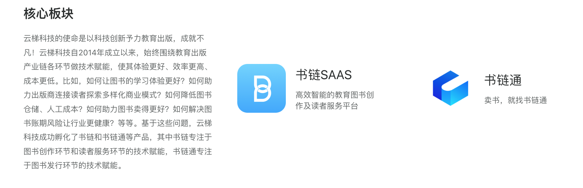 云梯科技以技术赋能教育产业链各环节,有两大核心业务:“书链SaaS” 和“书链通”。