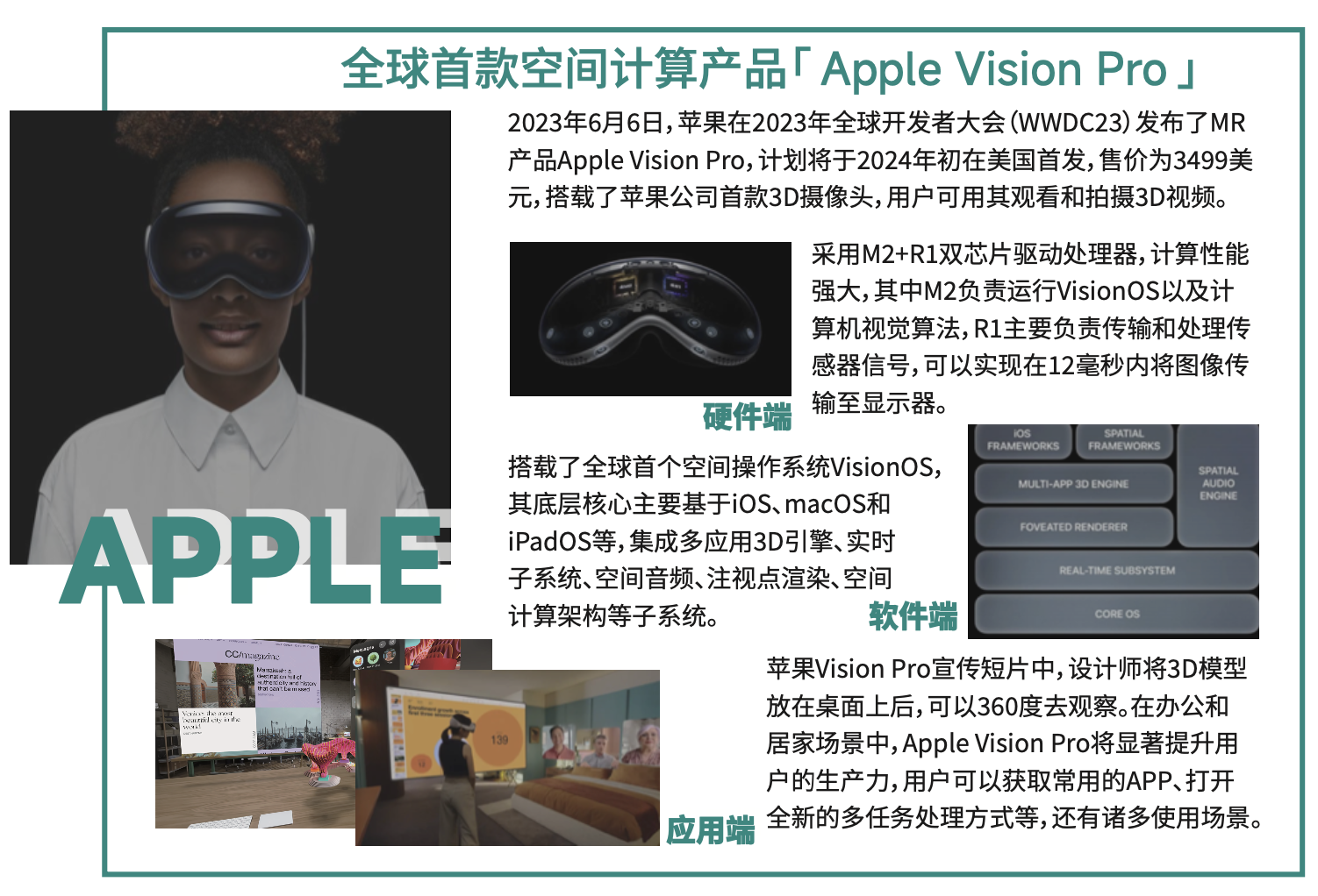 6月苹果在WWDC2023开发者大会上正式推出了第一款空间计算设备**Apple Vision Pro**,这一代表性消费级空间计算产品的问世,真正将「空间计算」这一概念推向大众并迅速普及。