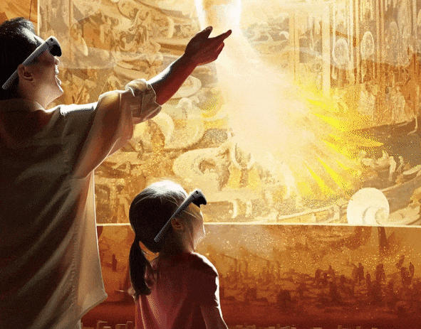 今年3月,“敦煌AR智能导览”落地敦煌莫高窟景区,成为敦煌游客数字化体验的常态项目。该项目同样由Rokid打造。这是AR眼镜首次应用到敦煌莫高窟的导览服务中,是国内文旅行业内首个基于单目视觉SLAM的AR眼镜导览方案。基于AI引擎、图片识别、3D场景展陈等技术,重现千年敦煌的绚烂文化。现场观众只需一副Rokid AR眼镜,便可以在数字导览员 “敦敦”的引导下,跨越时空,进入千年前的敦煌,沉浸式体验莫高窟的前世今生。