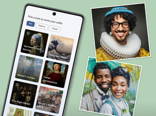 官方表示,艺术自拍2.0功能将再次使用户与艺术面对面,重新探访世界各地的艺术、历史和文化。用户可准备一张自拍照,随后通过该功能选择一种艺术风格,生成式AI 就能够在人物周边创建风格化的背景,将人物的自拍无缝融入选定场景中。目前其支持超过25种风格。