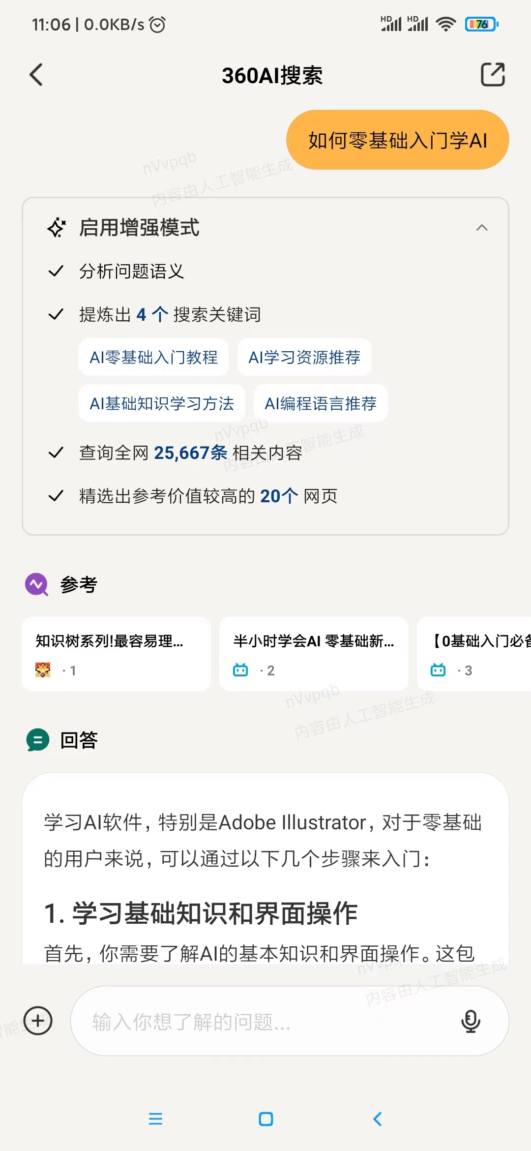 最后,360 AI搜索会根据用户的问题,生成逻辑清晰,有理有据、追根溯源的答案。