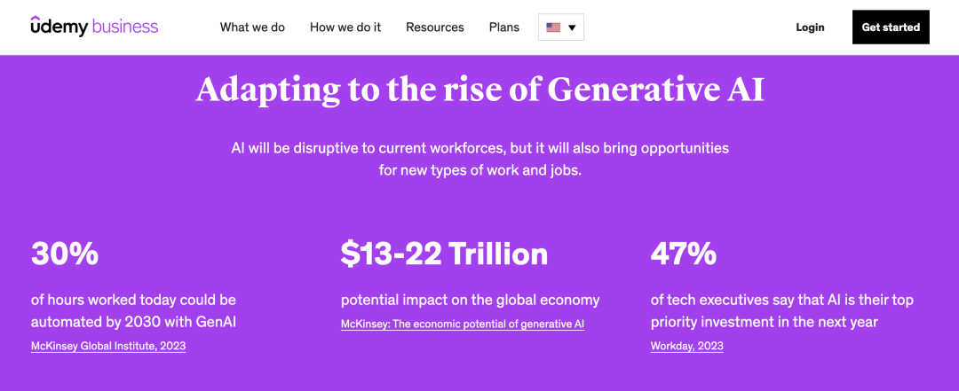 可以看到,以Udemy、Cousera等为代表的在线技能学习平台都在积极拥抱生成式AI,他们一方面推出生成式AI课程,一方面推出生成式AI工具,他们坚信,人工智能将颠覆当前的劳动模式,但它带来新类型的工作机会。