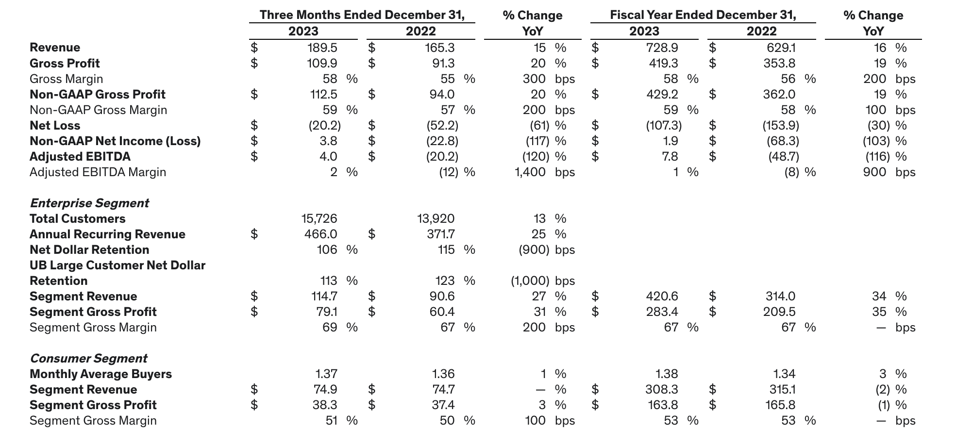 2023年Q4企业客户业务(即 Udemy Business)收入同比增长 27%,达到 1.147 亿美元,其中包括汇率同比变化 2 个百分点的负面影响。