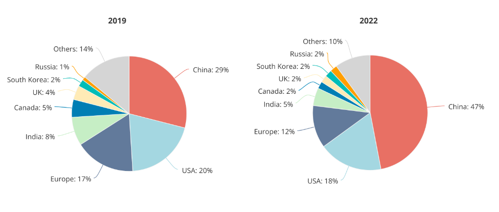 美国仍是顶级AI人才的首选工作地;除了美国和中国之外,英国和韩国以及欧洲作为顶级AI人才工作目的地的竞争力略有提高;中国在过去几年扩大了国内AI人才库,以满足本国不断增长的AI产业的需求,中国培养了相当大比例的全球顶尖AI研究人员(占比从2019年的29%上升到2022年的47%)。