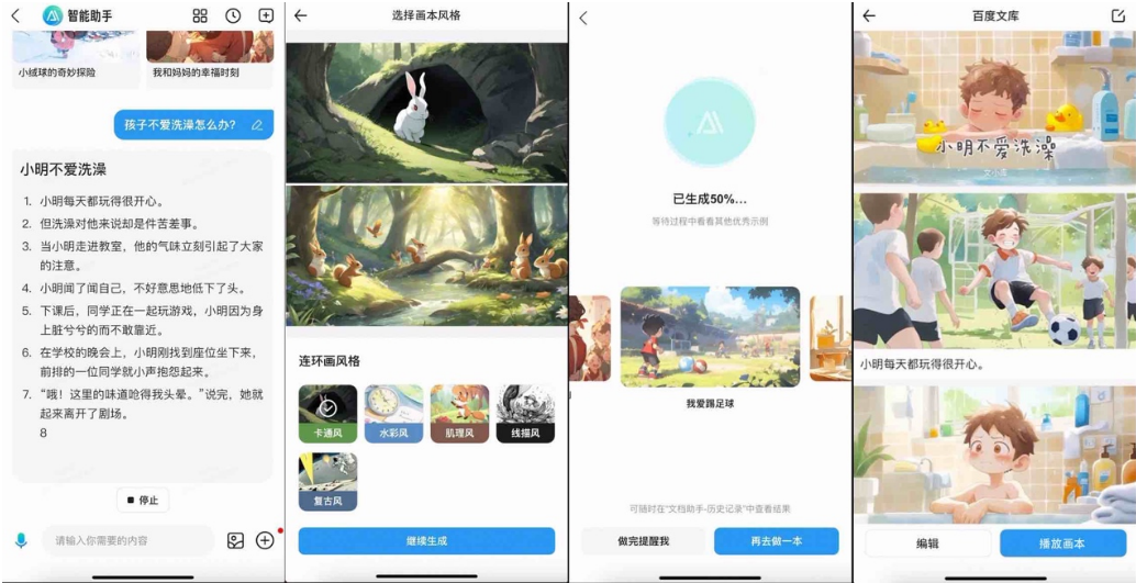 例如,当父母发愁“孩子不爱洗澡怎么办”时,可以在百度文库APP内输入一句话主题,如“帮我生成一篇主题为“小明不爱洗澡”的绘本”,百度文库AI就会自动生成故事脚本,用户选择画本风格后,AI即可自动生成视频画本。如同纸质绘本一样的翻页和语音朗读体验,进一步增强了亲子交流的互动性和趣味性。除图文故事外,百度文库“智能画本”即将上线配音功能,大幅提升绘本朗读的音色拟真性和环境融合性,将提供更加丰富、多元的专属故事创作体验。