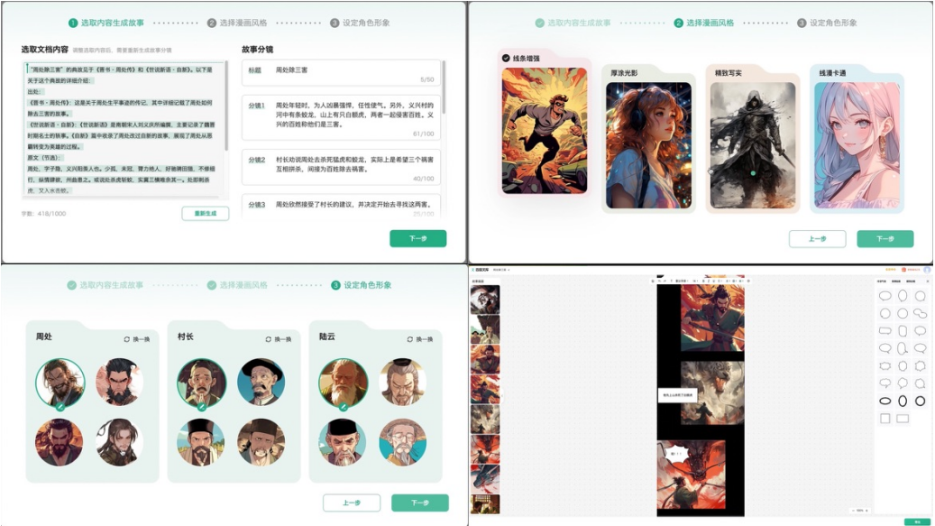 以《周处除三害》为例,在百度文库上,只需要输入《周处除三害》相关的“一句话”主题,百度文库将检索相关内容,自动生成完整的故事分镜和脚本。用户进行内容调整后,可以选择线条增强、厚涂光影、精致写实、线漫卡通等多种漫画风格,设定多种角色形象。设置完毕后,百度文库AI将全自动生成完整漫画作品,自动匹配丰富的人物对话文本,用户可继续在编辑器中进行精调。