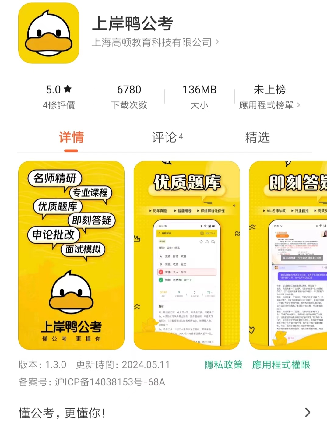 多知5月15日消息,近日,高顿教育推出“上岸鸭公考”App,并宣布高顿公考更名为“上岸鸭公考”。