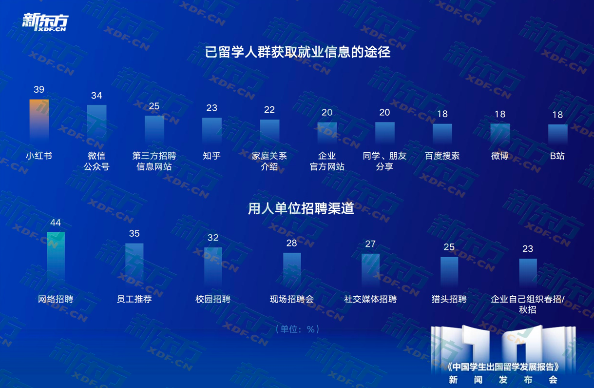 在求职平台方面,传统招聘网站单向传递招聘启事的方式已经无法满足已留学人群的求职需要,他们更希望在投递简历前能够获得更加全面的信息,因此在求职平台的选择上也从传统招聘网站转移至社交媒体。2024年,小红书与微信公众号大幅超越招聘网站成为已留学人群获取招聘信息的主要渠道。(详见《中国学生出国留学发展报告》P28页)