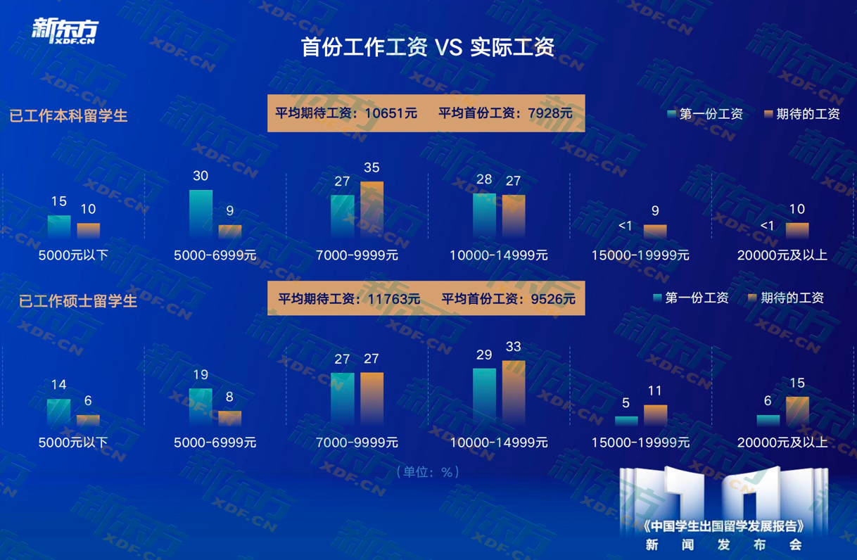 根据2024年调研数据显示,本科留学生的首份薪资总体在5,000-14,999元之间,而硕士留学生的首份薪资主要集中在7,000-14,999元之间,起薪点相对更高。值得注意的是,从本科留学生的期待薪资趋势中也能看出,他们普遍对自己报有较高的自信,对15,000元以上的高薪期待占比与硕士留学生相差无几,但实际情况是他们很难从首份工作中就获得如此高的薪水,而部分硕士留学生则存在一定机会。从平均工资来看,不论是本科留学生还是硕士留学生的期待薪资均高于实际首份工资,且差距在2,000元以上,理想与实际存在一定差距。(详见《中国学生出国留学发展报告》P28页)
