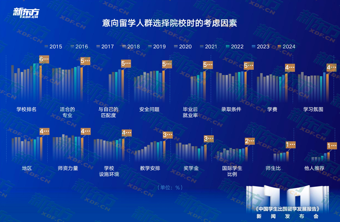 从连续十年的调研数据不难看出,意向留学人群很重视院校的排名。与此同时,就业率、学费影响力的涨幅也非常明显。特别是在2020年之后,伴随着就业压力、经济大环境及通货膨胀的影响,越来越多的学生在择校时会将毕业后就业率和学费纳入考虑范围。