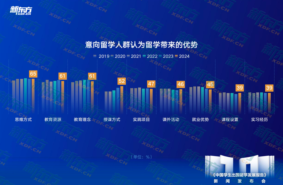 意向留学人群对于留学优势的看法也在发生变化。留学带来的“思维方式”“教育资源”“教育理念”这三方面,仍然是吸引学生留学的主要优势,占比均超六成。