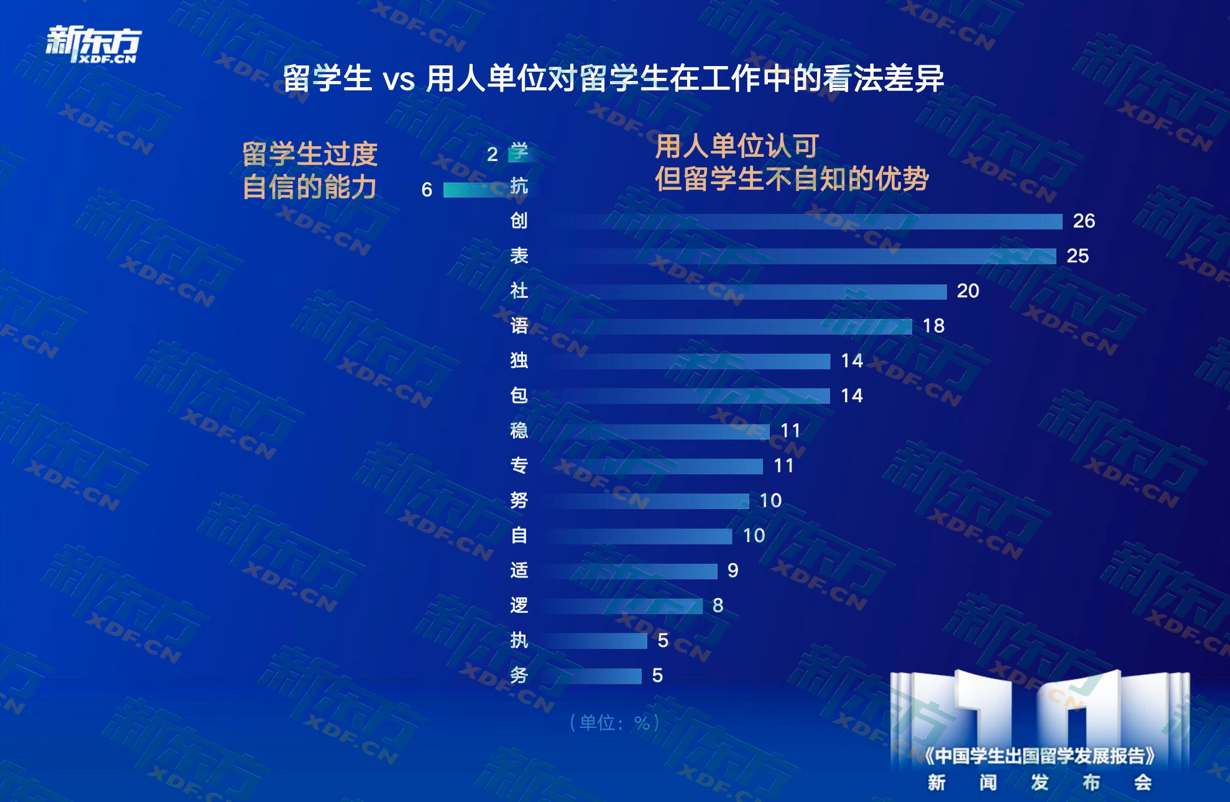 从2024年调研数据来看,留学生在创新能力、表现力、社交能力和语言能力上都备受用人单位好评,且用人单位对留学生的评价普遍高于留学生自评。不过,留学生对自己的学习能力和抗压能力比较自信,这两点在用人单位看来优势有限。(详见《中国学生出国留学发展报告》P414页)