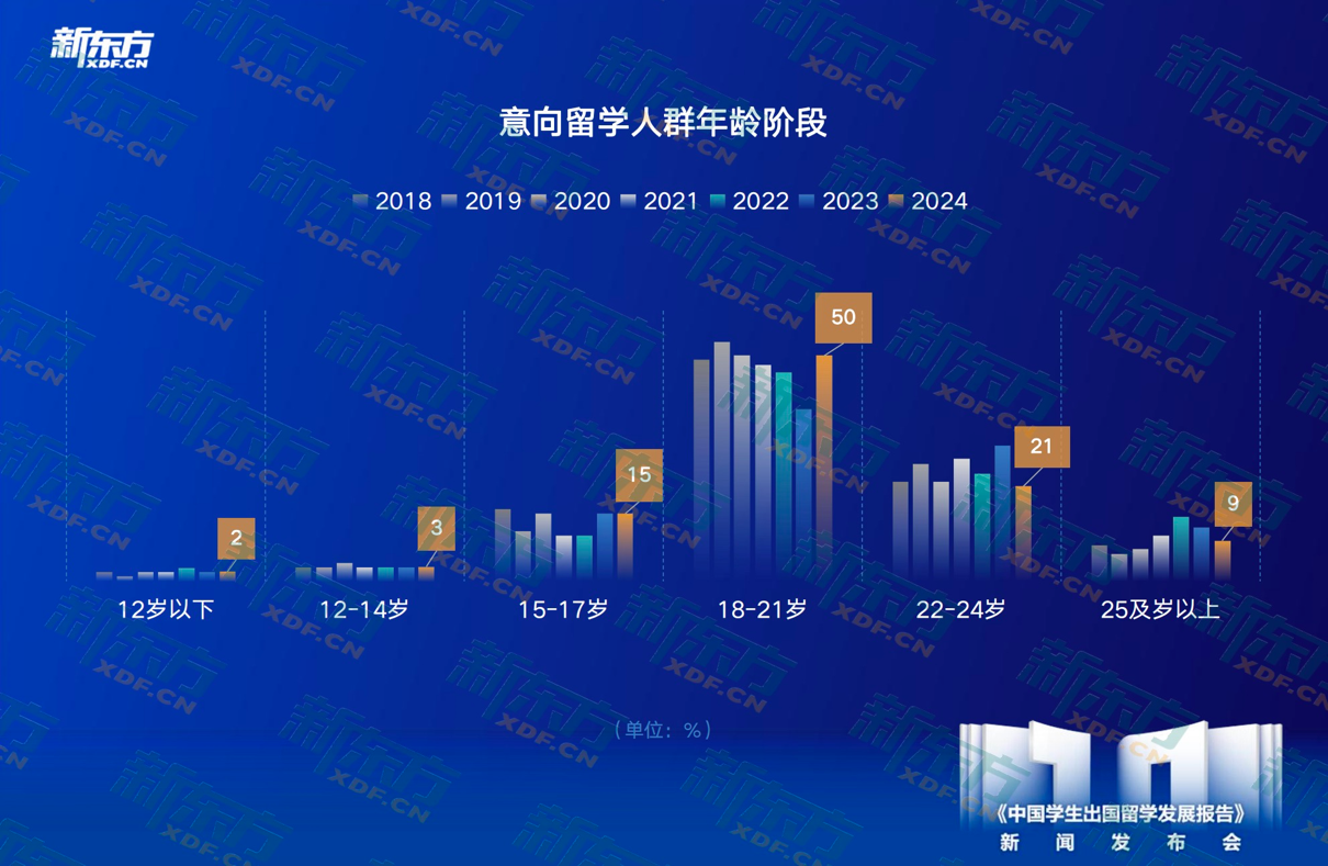 从年龄来看,中国意向留学人群的年龄主要集中在18-21岁。虽然在2023年之前,该阶段占比有逐年下滑趋势,但随着留学逐渐回归正轨,这部分人群留学意向在2024年大幅反弹,人数占比恢复至2020年水平。(详见《中国学生出国留学发展报告》P2页)