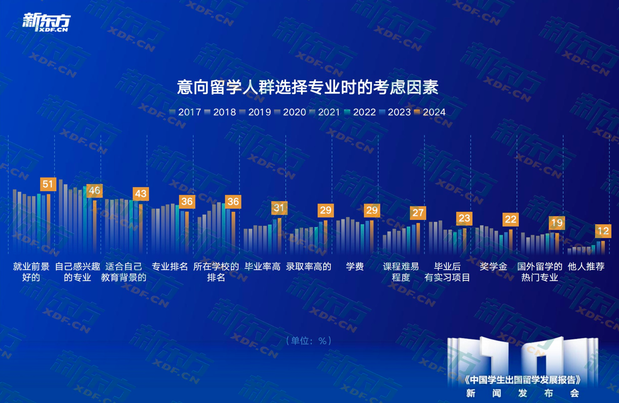 意向留学人群在专业选择上也越来越受到就业市场的影响。在留学市场逐渐放开后,就业前景的重要性也随之回升,兴趣和与自身教育背景适配度的重要性呈下滑趋势,不再是选择留学专业的决定性因素。与之相反,录取率高、毕业率高、口碑好的专业受到更多人青睐,“过来人”经验或专业团队意见的影响力也越来越大。(详见《中国学生出国留学发展报告》P18页)