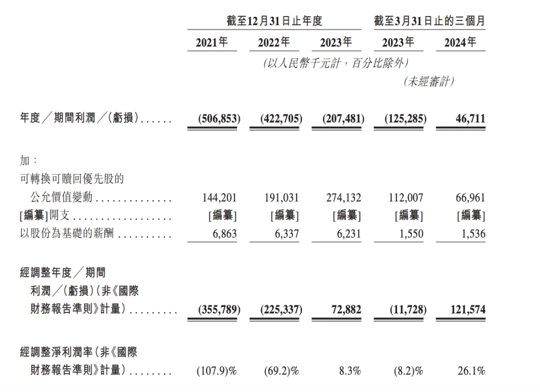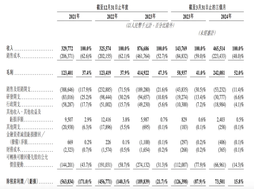 2021年、2022年、2023年及截至2024年3月31日止的三个月,分别录得毛利润率37.4%、37.9%、47.3%、52.0%,毛利润率持续提升。非国际财务报告准则下,经调整,2021年、2022年为亏损状态,净亏损分别为3.56亿元、2.25亿元,2023年扭亏为盈,净利润7288万元;截至2024年3月31日止的三个月,录得经调整期间净利润1.22亿元,而2023年第一季度净亏损1172万元。