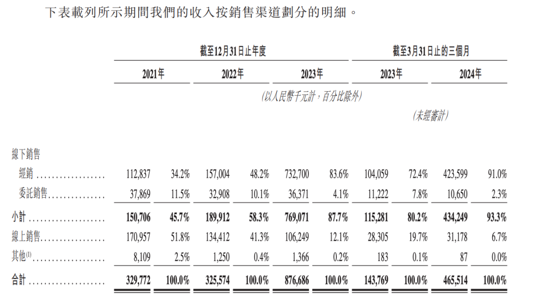 线上渠道方面,主要通过(i)在天猫、京东、抖音、拼多多及中国其他电商平台开设旗舰店,及(ii)微信小程序布鲁可积木人Club建立线上渠道。其次,亦按与线下委托销售合作伙伴或线下经销商类似的安排向若干电商平台销售产品。2021年、2022年、2023年及截至2024年3月31日止的三个月,线上销售收入分别为1.71亿元、1.34亿元、1.06亿元及3120万元,占各期间总收入的51.8%、41.3%、12.1%及6.7%。可以看到,在线渠道的营收占比正在下降。