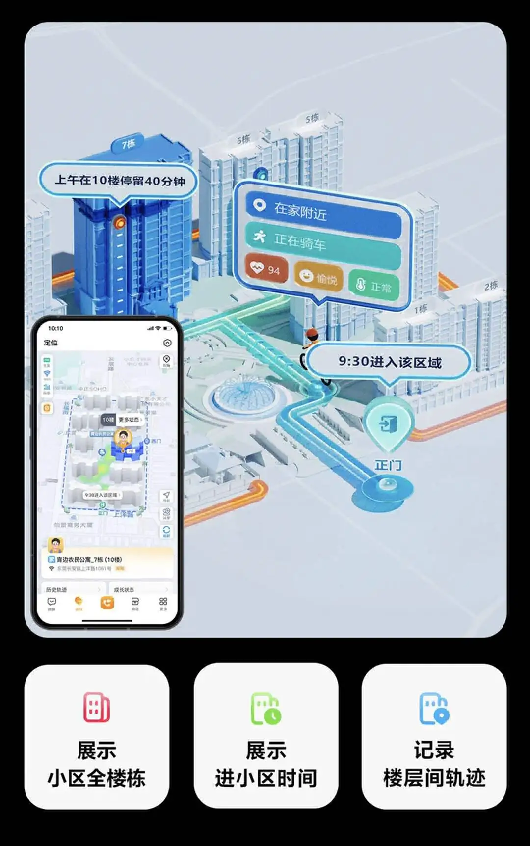 Z10延续了小天才碰一碰的社交壁垒,2299元的价格也已经逼近最初的三倍,而在安全定位上,Z10此次围绕“精准”做出了不少升级,包括楼层识别更加精准、精细还原一整天的生活路径、以及覆盖海外大部分地区的信号频段……