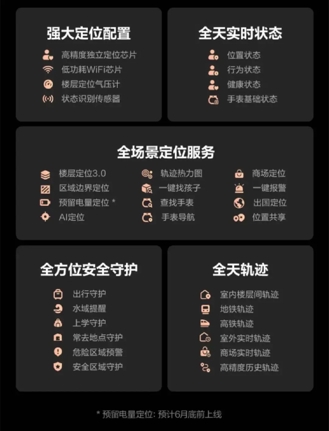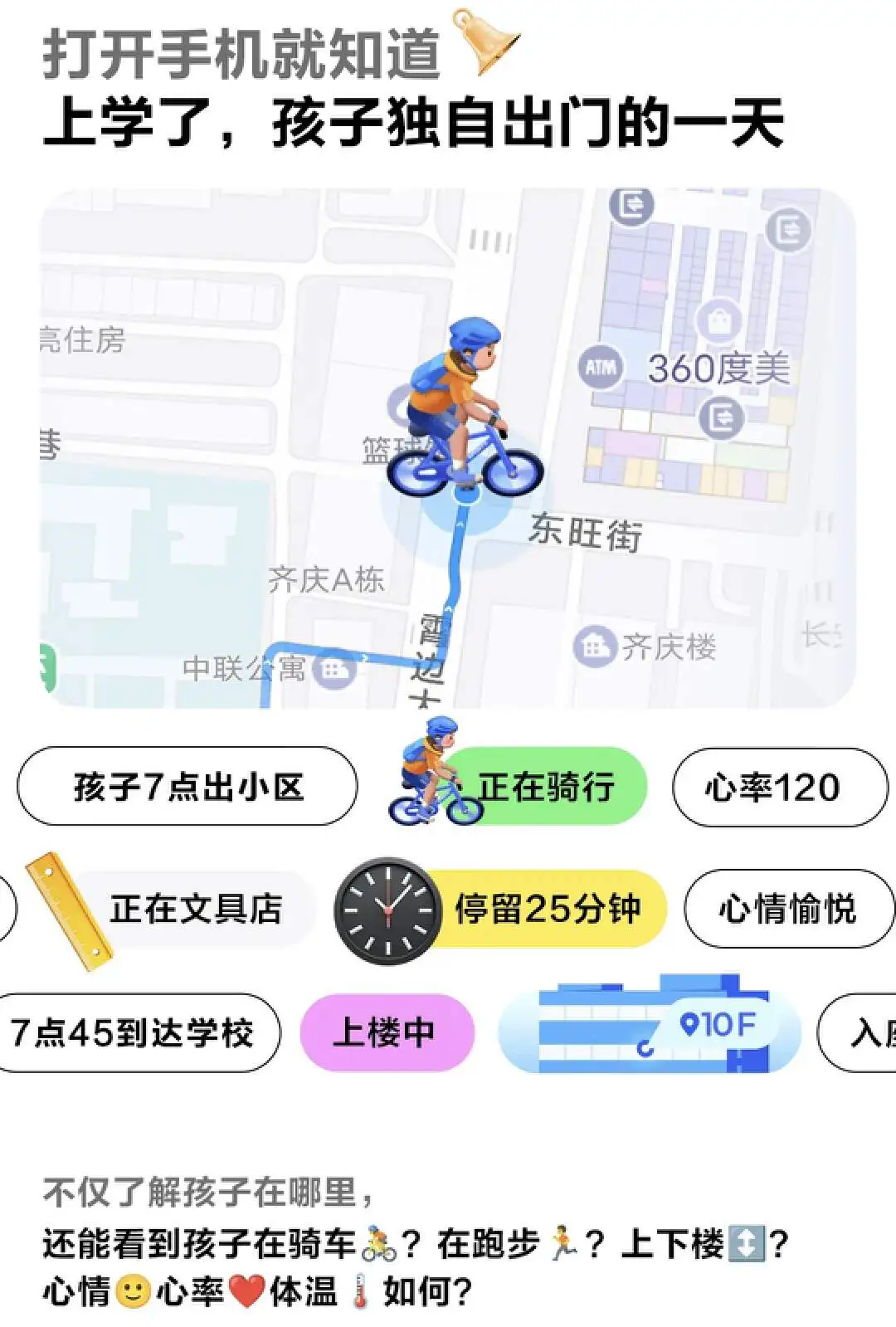出行守护,孩子在户外的一切可能会让家长担心的行为都会被手表记录并形成生活轨迹,例如快速奔跑、骑车过快、马路乱窜等等;