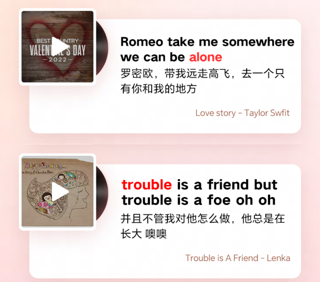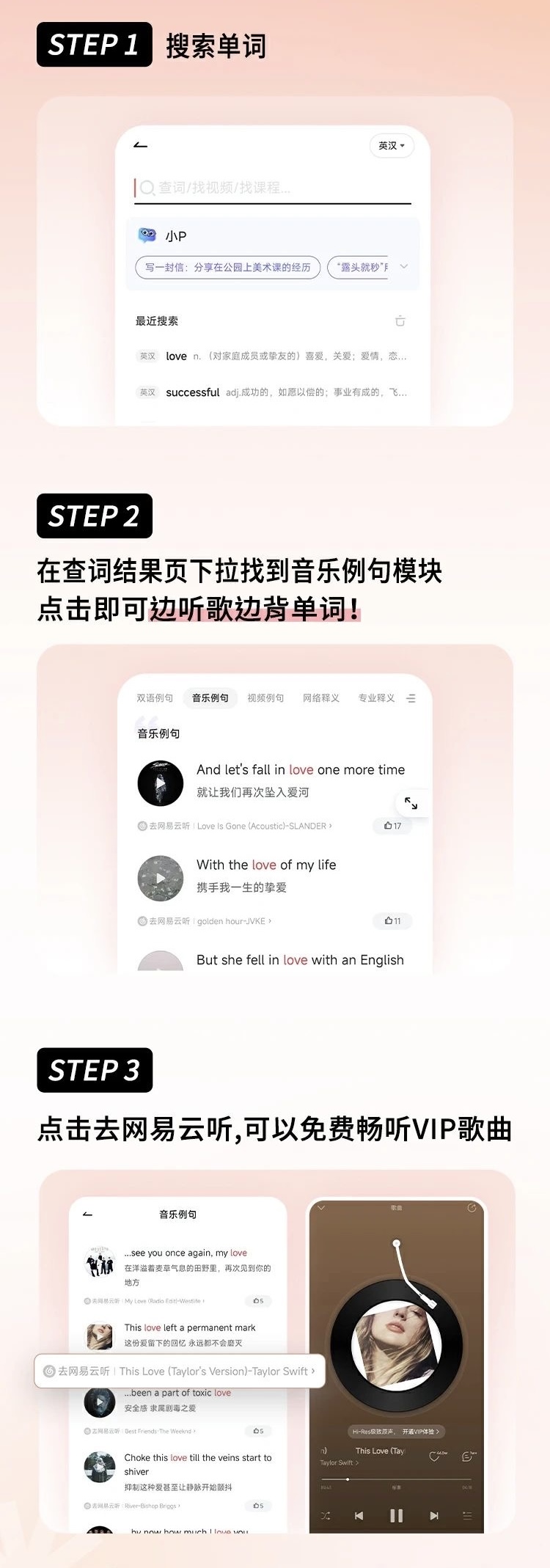 据介绍,有道词典用户在搜索单词时,除了能够查看原有的双语例句外,还能听到来自网易云音乐提供的英语歌曲例句。