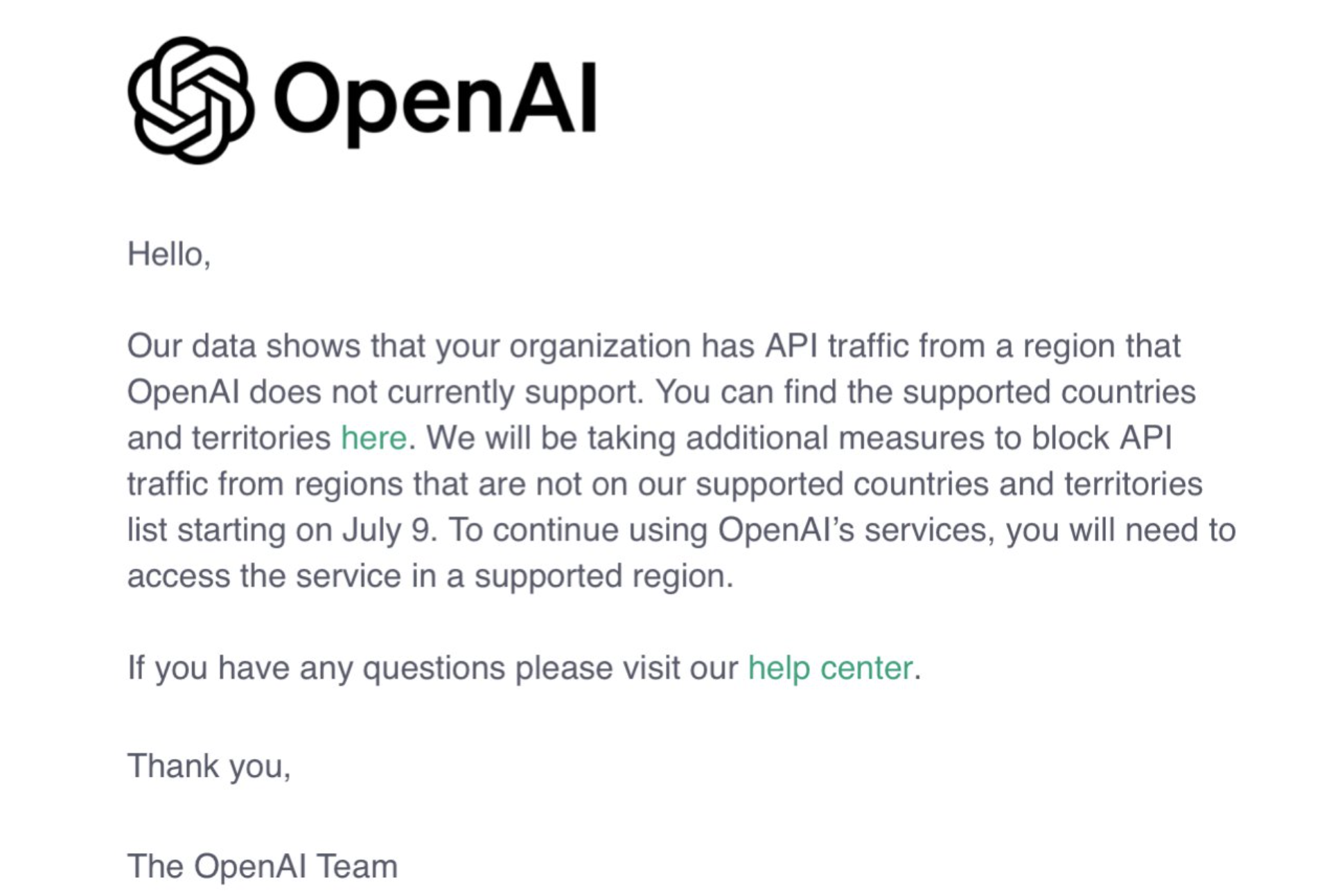 多知6月25日消息,部分开发者收到OpenAI发送的官方邮件,邮件显示,将从7月9日起采取额外措施,阻止来自非支持国家/地区的API流量。