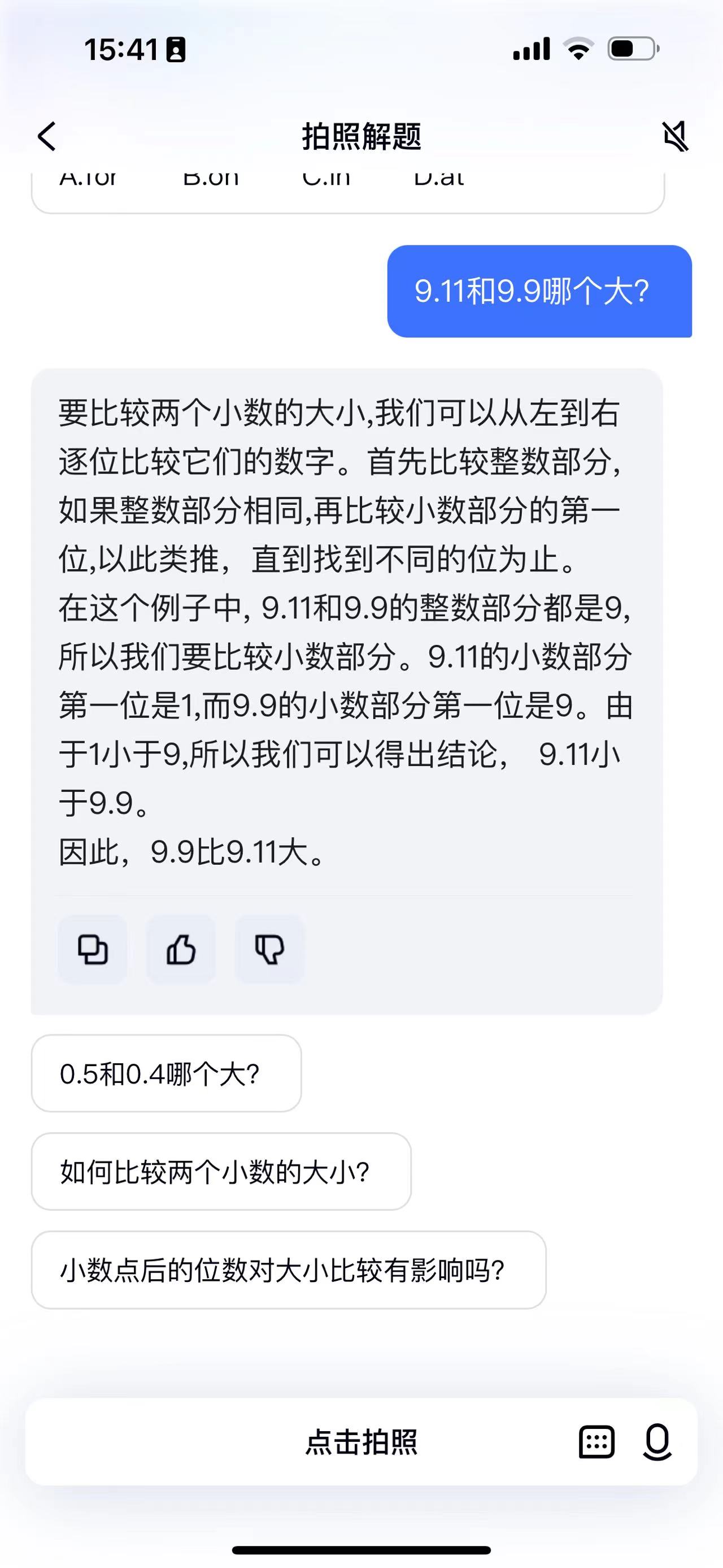 在最近热议的#大模型测不出9.11和9.9哪个大#话题中,有道小P按照步骤给出了正确的分析和答案,也有举一反三推荐了一些题型巩固: