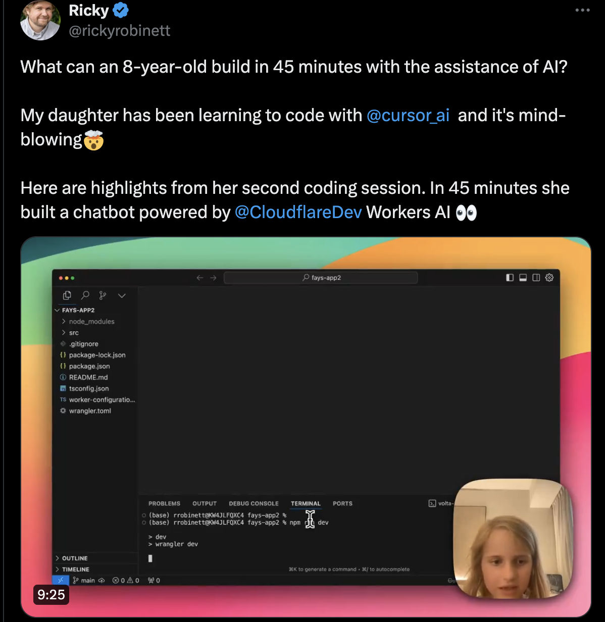 开发者关系和社区Cloudflare副总裁Ricky家8岁的女儿用Cursor在45分钟内搭建了一个聊天机器人。
