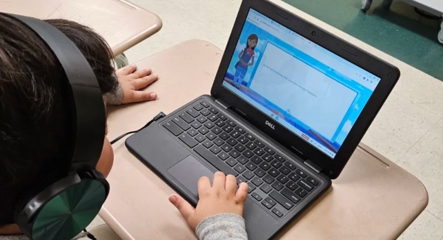 Amira的卡通形象站在屏幕边上,面带微笑,带领孩子们进行一项让他们大声朗读的活动,这是一个帮助孩子阅读的人工智能程序。