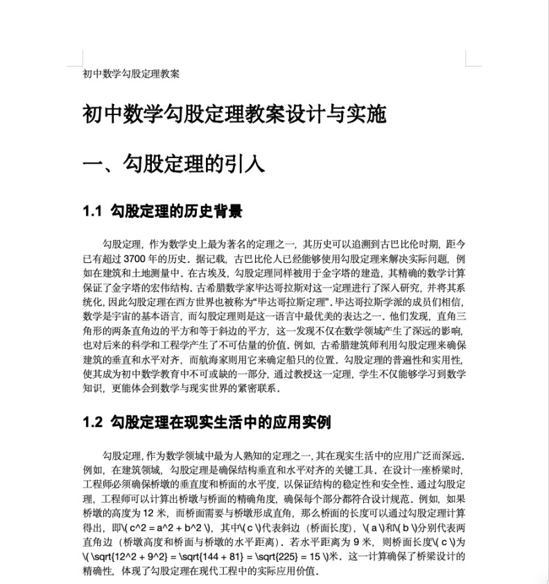 例如,初中数学老师生成教案,直接在WPS文字里唤醒「AI帮我写」,选择「文章大纲」,输入 "初中数学勾股定理教案" 主题,仅需几秒,带三级标题的完整大纲就弹了出来,教学活动设计、随堂检测、甚至教学资源和辅助工具都穿插其间。