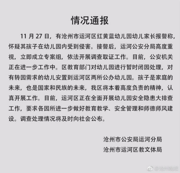 针对河北省沧州市运河区红黄蓝幼儿园被爆出疑似存在老师拿针扎孩子的行为。沧州市运河区委员会宣传部官方微信回应表示,警方已成立专案组,依法开展调查取证工作。运河区教育部门对幼儿园进行暂时闭园处理,对有转园需求的幼儿安置到运河区两所公办幼儿园。