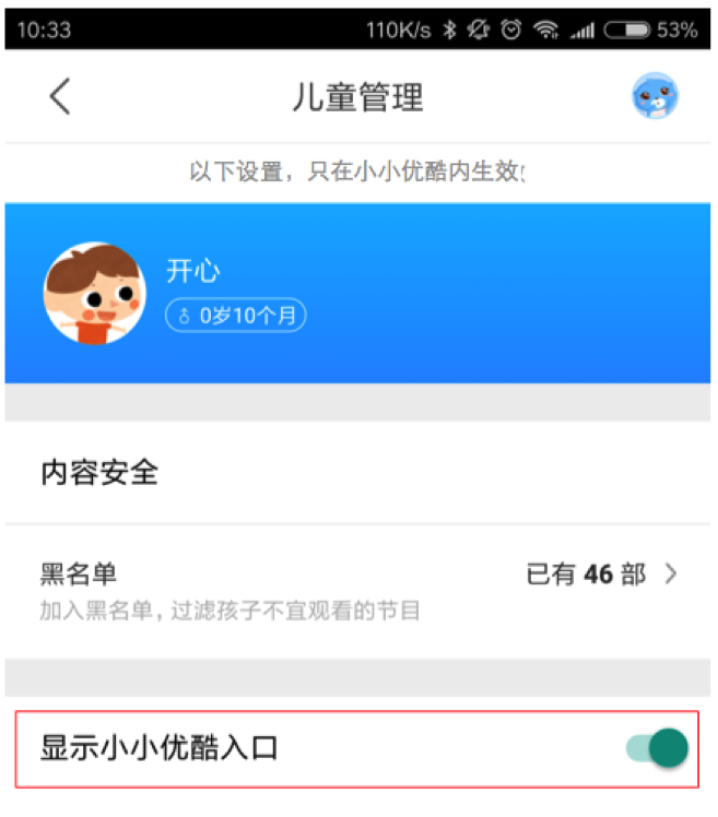 通过“我的-个人服务-儿童管理”里打开“显示小小优酷入口”,在优酷App的主界面就会出现“小小优酷”入口LOGO,进入儿童模式。