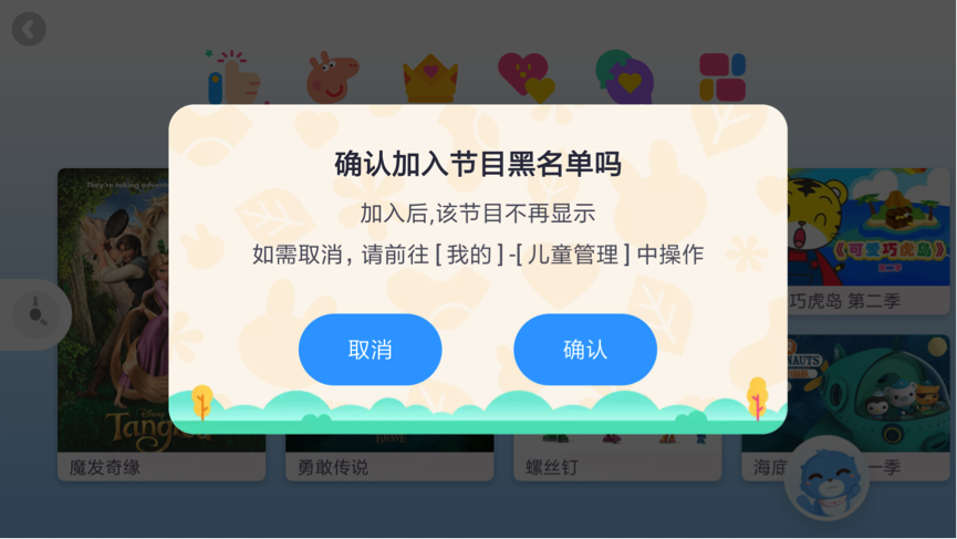 第二重保障是“黑名单”功能,由家长干预,长按节目就能直接屏蔽掉不良内容。