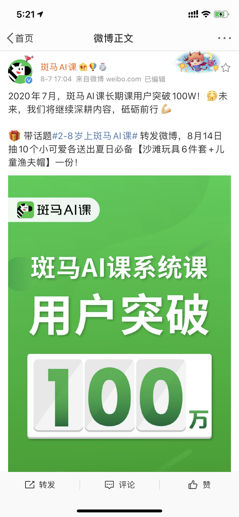 多知网8月7日消息,根据斑马AI课官方微博披露,2020年7月,斑马AI课长期课用户突破100万。这是斑马AI课继今年3月被爆单月营收突破3亿元之后再次更新的成绩。